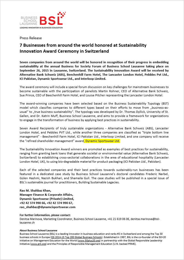In 2015, Dynamic Sportswear was honored with the Sustainability Innovation Award by Business School Lausanne one of just seven companies selected globally for their leadership in sustainable business practices. Among them, we were the only recepient to receive recognition, awarded in the category of Refined Shareholder Management.